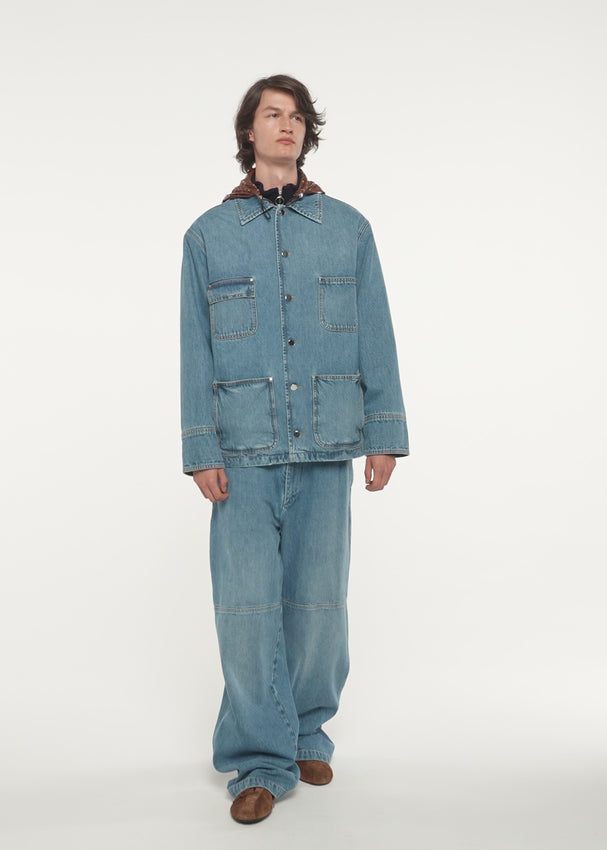 ウォッシュドデニムのカーゴジャケット。シャイニーなブラウンカラーの取り外し可能なフード付き
